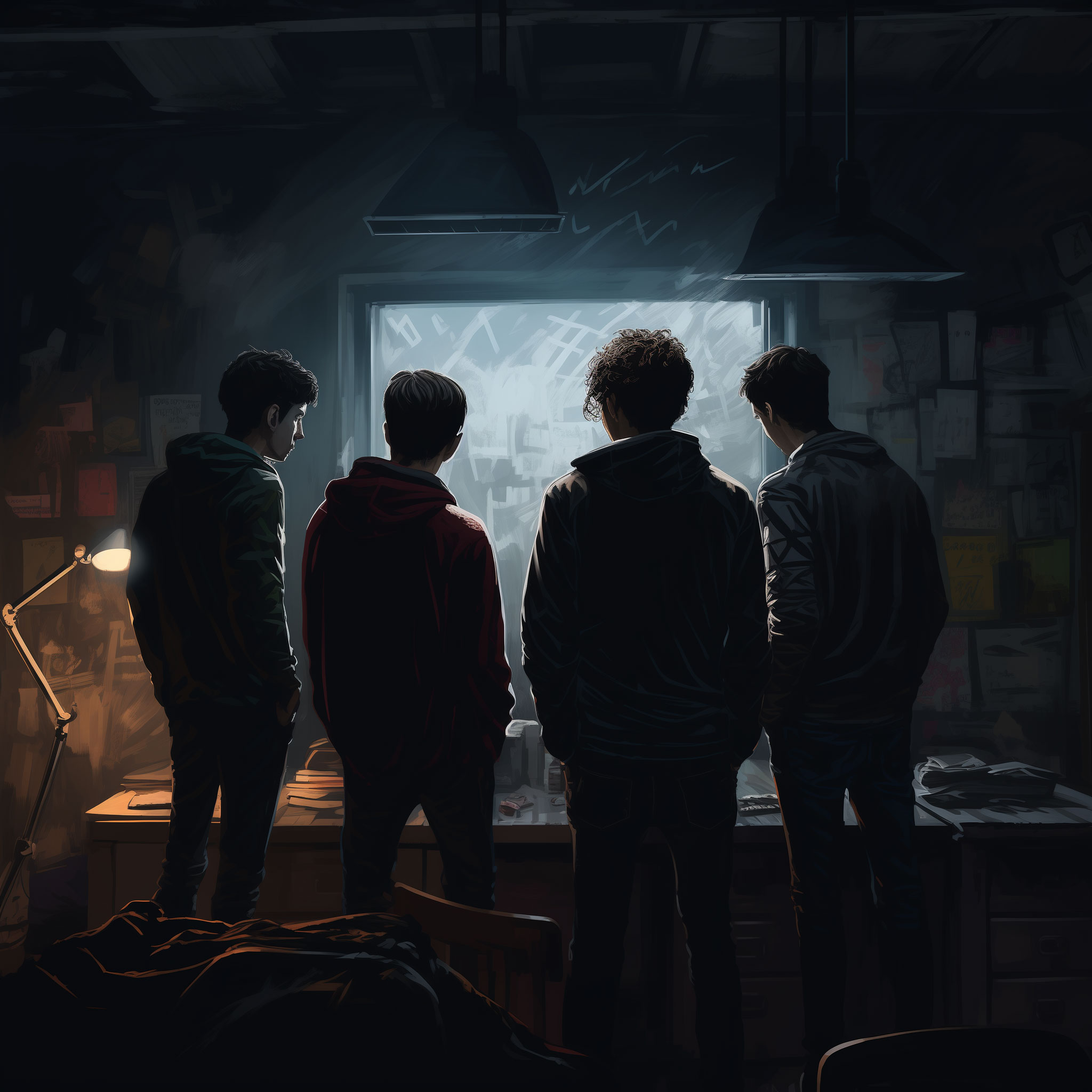 در کنار انباری مدرسه گاری کهنه و فرسوده ای وجود دارد که زیر آن یک در فلزی زنگ زده ای است که به اتاقکی تاریک و سرد در زیرزمین راه دارد هنگامی که درب آن را باز می کنند پله های زنگ زده و قدیمی مشاهده میشود وقتی از پله ها پایین می رود به اتاقک کوچکی می رسد که دیواره های آن از جنس فلزی زنگ زده ی است که هنگامی که به آن نگاه می کنیم به یاد زندان های قدیمی می افتیم بالای آن دیوار زنگ زده پر از تار عنکبوت و در گوشه اطراف اتاق سوراخ های کوچک وجود دارد که محل زندگی سوسک و حشرات بزرگ است وسط اتاق یه میز پنج نفره ی کوچک فرسوده ای است که از گرد و غبار پوشیده شده است زیرا آخرین باری که در این مکان جمع شده بودند برای عملیات یک ماه پیش بود آن اتاق تاریک بود و انتهای آن یک تک چراغ کوچکی از سقف آویزان است که انگار اتصالی دارد این اتاق محل برگزاری جلسه ی مخفیانه ی یک گروه پنچ نفره از دانش آموزان پایه یازدهم که گنگ و قلدر مدرسه اند و بسیار خودخواه اند و همه چیز را برای خودشان میخواهند است و از کار و فضای مدرسه بسیار متنفراند و بر هر نحوه ی میخواهند آن قارون خسیس و خود دوست را مجبور کنند که برای مدرسه دستی تکان دهد